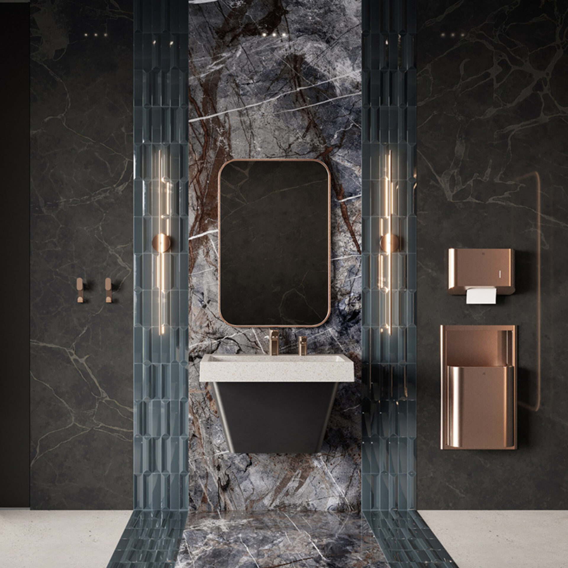 Elvari brings unity and elegance to the most functional spaces. With pill-shaped curves, seamless joints, and smart refill indicators, this stainless-steel collection balances aesthetics with efficiency. Available in a palette of modern finishes, it gives designers creative freedom to make hospitality restrooms as refined as the rest of the interior.